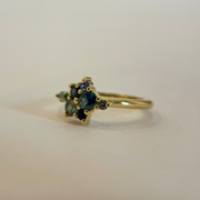 Each one of our cluster rings is one of a kind and features a collection of blue and teal sapphires in a range of sizes, shapes and tones. The sapphire cluster is set in 18ct yellow gold on a half round to knife edge band, giving it a dainty look but in materials that will last a lifetime. This ring would make the perfect engagement ring for someone who likes a playful, unique and less traditional style.