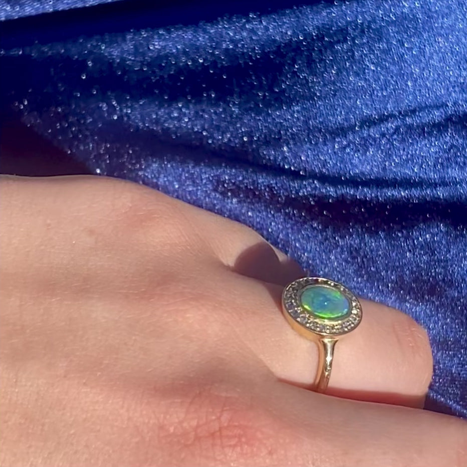 This celestial ring features a stunning 0.80ct Australian Lightning Ridge Opal framed with a halo of twenty Australian Sapphires. The unique colouring of the opal accompanied by the dazzling halo...