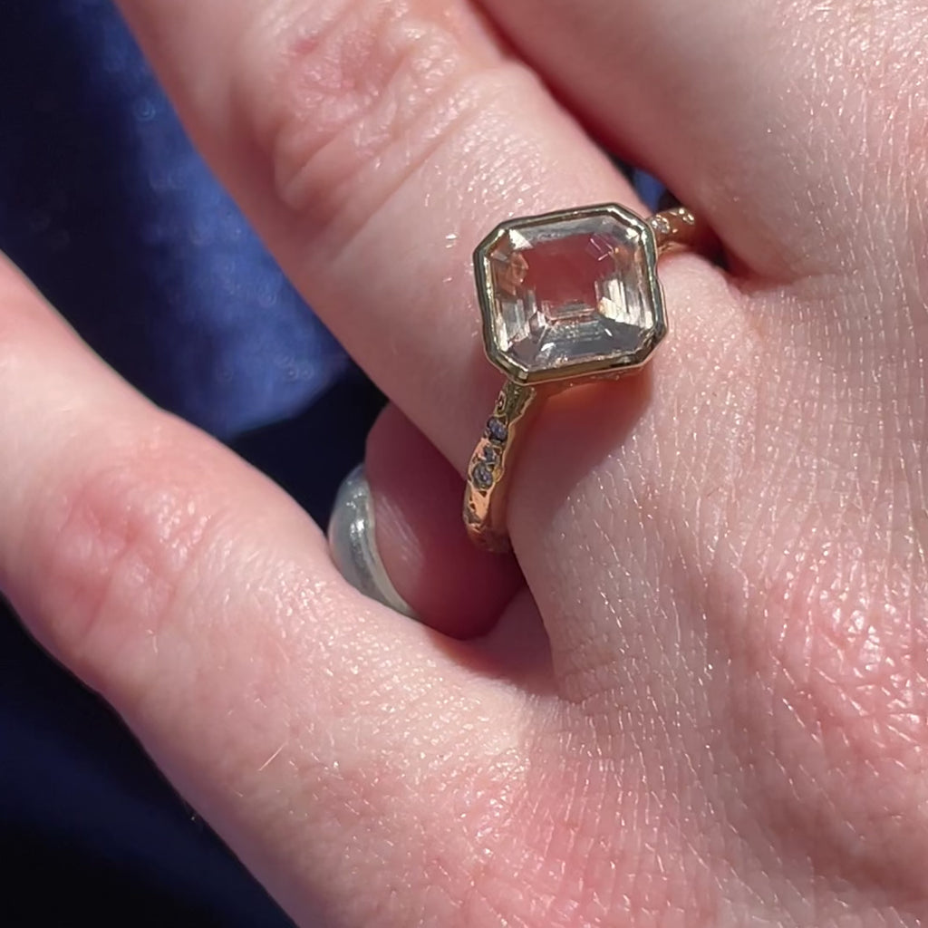 A dazzling 2.14ct square emerald cut sapphire with a lovely peach hue. This stunning stone is framed in an textured bezel set with with twelve round brilliant cut diamonds peppered...
